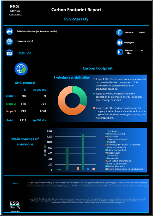 - Yhtiönne taloustietoihin perustuva hiilijalanjäljen laskenta, jossa on huomioitu yksityiskohtaisemmin päästölähteet. Valittavissa haluamasi vastuullisuusmittarit sekä vapaamuotoisempi raportointi yhtiönne nykytilasta. Voit valita kuukausi-/kvartaaliraportoinnin.